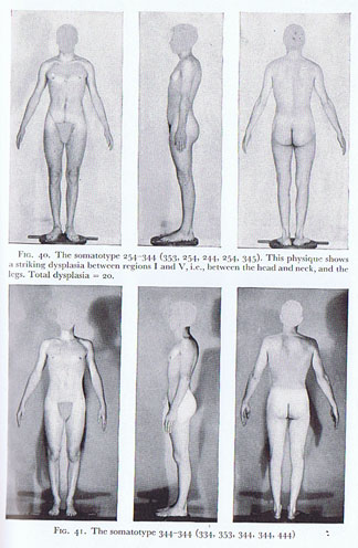 This is the most extreme of the microsplanchnic physiques. The trunk is excessively flat, and is relatively narrow and relatively short. In the first region (head), we find a small, hypoplastic face, fragile features, and the moderately long, extremely slender neck. Both face and cranium are of variable shape in the 117. The cranium is occasionally of fairly large size, but the face is always small. The nose is usually both slender and short. The jaw is weak and receding. The upper trunk usually shows a sharp, high kyphotic curving of the vertebral column, with flat upper chest and marked lack of anteroposterior depth…”